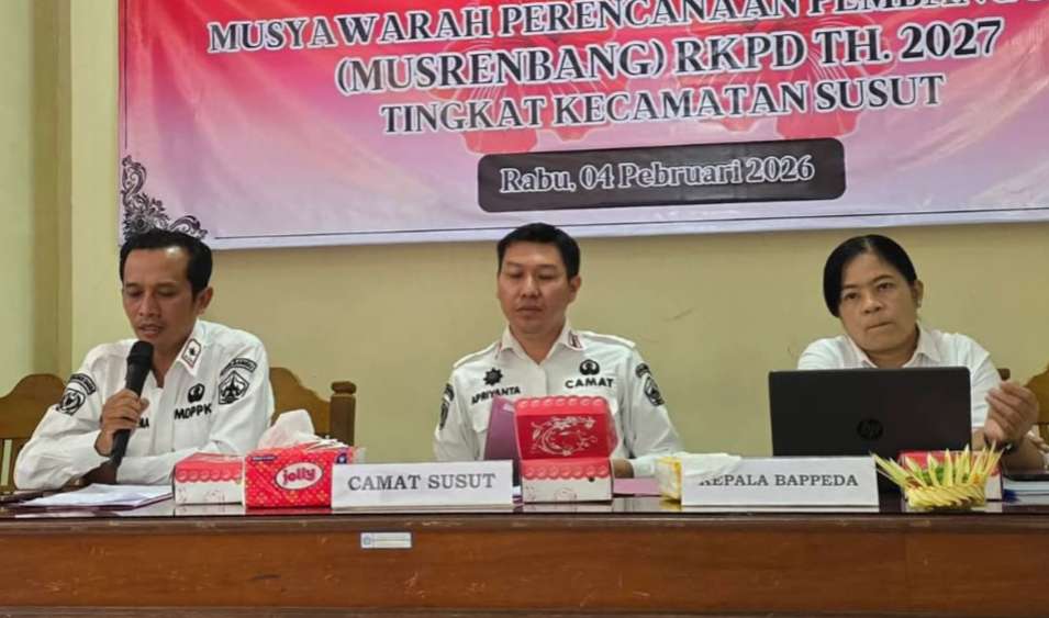 Ortidewata.com-Bangli-Pemerintah Kecamatan Susut menyelenggarakan Musyawarah Perencanaan Pembangunan (Musrenbang) RKPD Tahun 2027 bertempat di Ruang Rapat Kantor Camat Susut. Kegiatan ini dihadiri oleh Kepala Dinas PMDPPKB Kabupaten Bangli, perwakilan Bappeda Kabupaten Bangli, perwakilan perangkat daerah terkait, Kapolsek Susut, Danramil 1626-02 Susut, MDA Kecamatan Susut, Ketua TP PKK Kecamatan Susut, para Perbekel se-Kecamatan Susut, Ketua TP PKK Desa se-Kecamatan Susut, Ketua BPD se-Kecamatan Susut, Kepala Kewilayahan se-Kecamatan Susut, dan Ketua Yowana Kecamatan Susut.