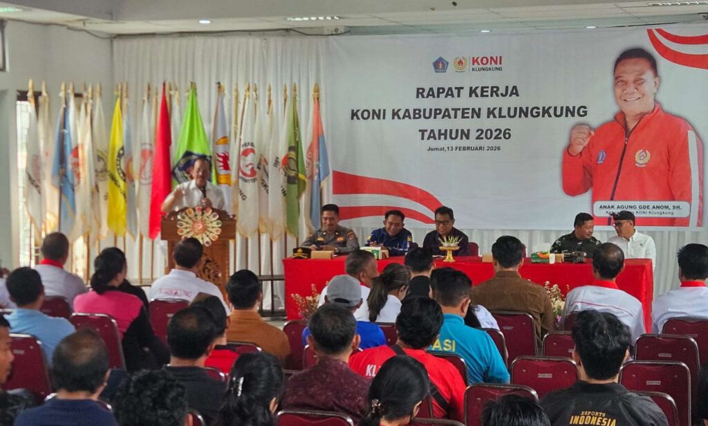 Ortidewata.com- Klungkung-Komite Olahraga Nasional Indonesia (KONI) Kabupaten Klungkung menggelar Rapat Kerja Kabupaten (Rakerkab) Tahun 2026 di Gedung KNPI Klungkung, Jumat (13/2). Forum tahunan ini secara strategis merumuskan program prioritas yang berfokus pada pemusatan latihan (Training Center) bagi atlet peraih medali serta penguatan akuntabilitas organisasi.